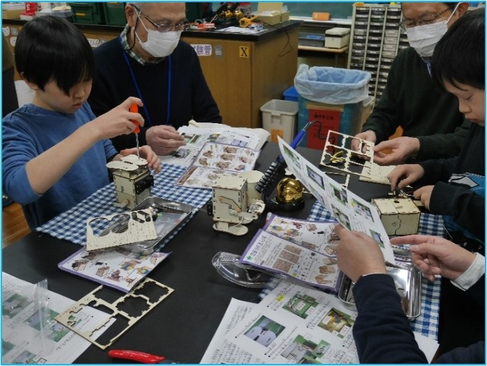 コインを乗せるとスイッチが入り、口を開け体内に取り込むロボットを組み立てた。はんだ付けの体験もした。